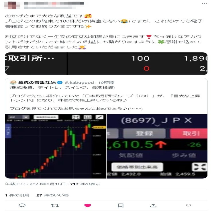 私のTwitterのDMやRTメセージに、いつも応援メッセージを送ってくれていたお姉ちゃんも、実は「日本最強株リスト2023」を読んでくれていたみたいで、JPXで大きな利益が出ていたよ♪ 本当におめでとう♪