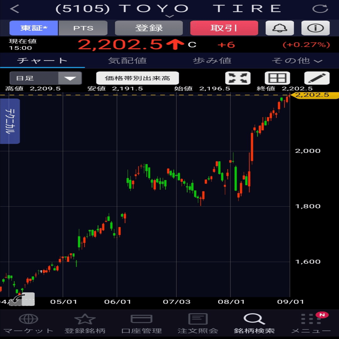 「【株FX】プロ投資家の企業分析【2022年9月15日】」で先出し紹介していた「東洋ゴム工業(TOYO TIRE)」が、株価1662円▶2202円の『プラス32%』に大幅上昇したよ♪ おめでとう♪(*^^*)