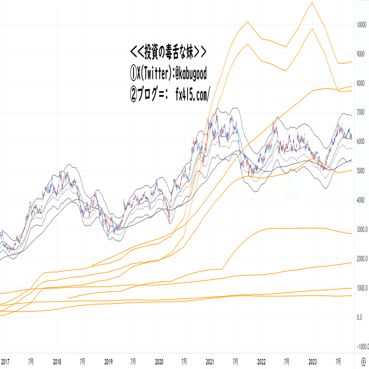 ◯「日経バブル」が崩壊する場合や、任天堂に一時的な悪材料が出て下落トレンドになる場合は、下オレンジ線が示す通り、5000円~2900円以下で株価が推移する可能性が高いよ♪