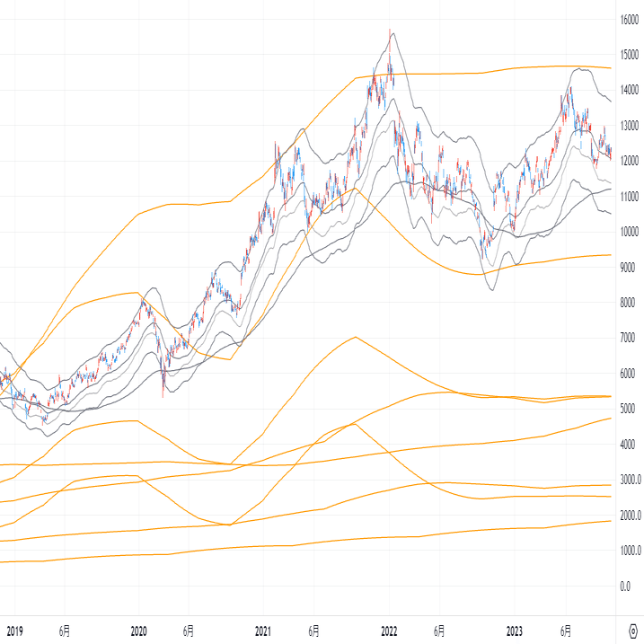 ◯「【日経バブル】が崩壊する場合や、【ソニーに大きな悪材料が出て下落トレンド】になる場合」の【適正株価】は、下側のオレンジ線や、線のカーブを加味して、5500円~4000円以下で株価が推移する可能性があるよ♪