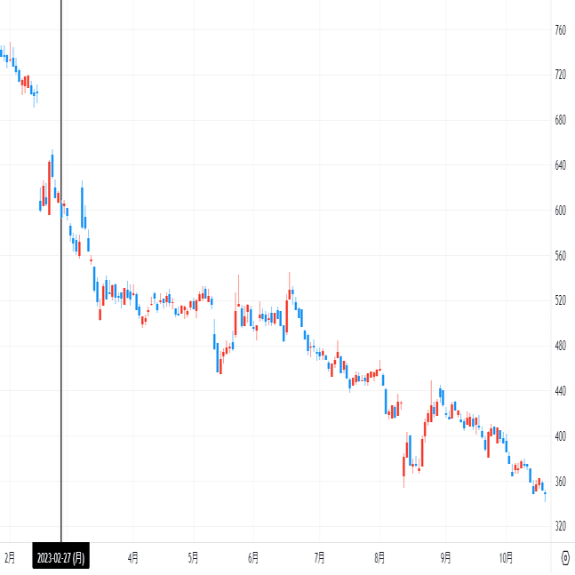 「【日本株】株価が下がったらほしい企業【2023年2月26日】」で先出し紹介していた「ブイキューブ【東証3681】」の株価が、「606円▶349円の『マイナス43%』に大幅下落」したよ♪