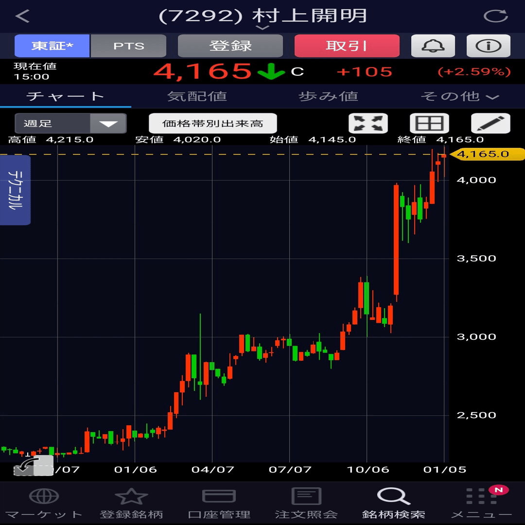 「【株FX】機関の仕込み買いを確認している企業リスト【note限定記事】」で先出し紹介していた「村上開明堂」が、株価2299円▶4165円の『プラス81%』に大幅上昇したよ♪ おめでとう♪(*^^*)