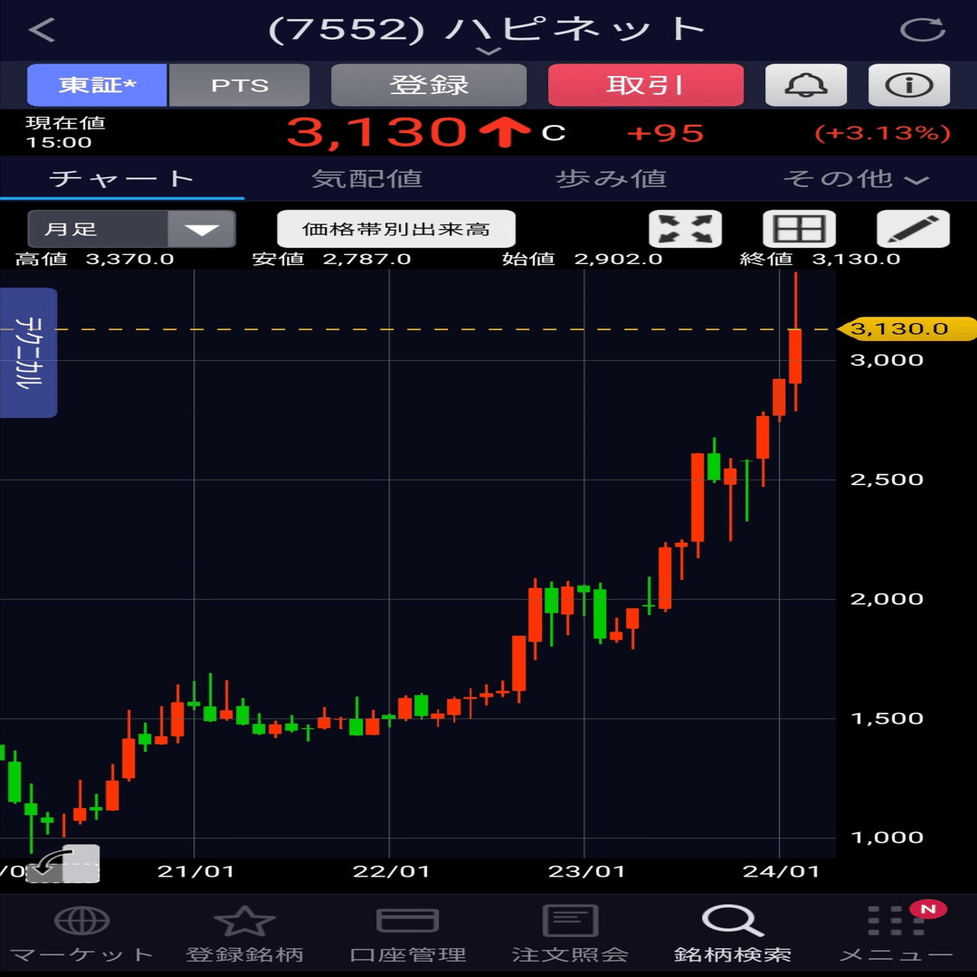 ブログで先出し紹介した「ハピネット(7552)」が、その後も順調に企業成長を続け、株価1336円▶3130円の「プラス2.34倍に大幅上昇」したよ♪ ダブルバガー達成して本当におめでとう♪(*^^*)