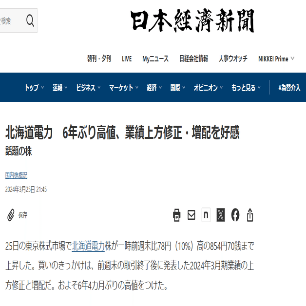 ブログの「この記事」で紹介していた「北海道電力」の株価が、
