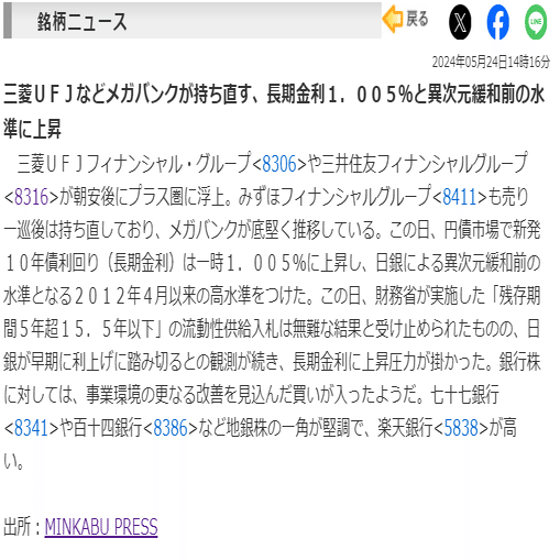 ブログの「この記事」で先出し紹介していた「三菱UFJ銀行」が、株価412円▶1696円の『4.12倍(クアドラプルバガー)』以上に大幅上昇したよ♪ おめでとう♪(*^^*)
