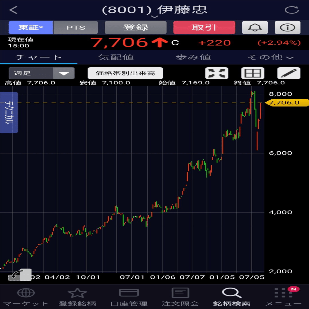 ブログで先出し紹介した「伊藤忠商事」が、順調に右肩上がりを続け、ついに2437円▶7706円( 『株価3.16倍』)に上昇したよ♪