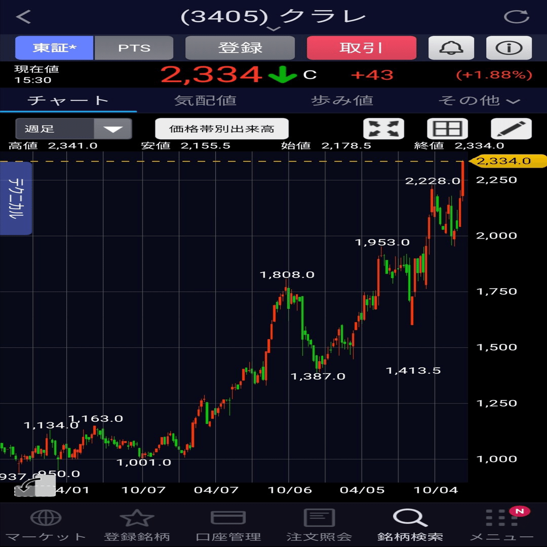 ブログで先出し紹介していた「クラレ」が、株価1086円▶2334円の『2.15倍』に大幅上昇したよ♪