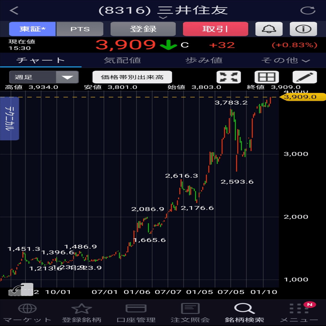 ブログの「この記事」で先出し紹介していた「三井住友フィナンシャルグループ」が、株価1017円▶3909円の『3.84倍(トリプルバガー)』以上に大幅上昇したよ♪( ◀株式分割済みの数値 )